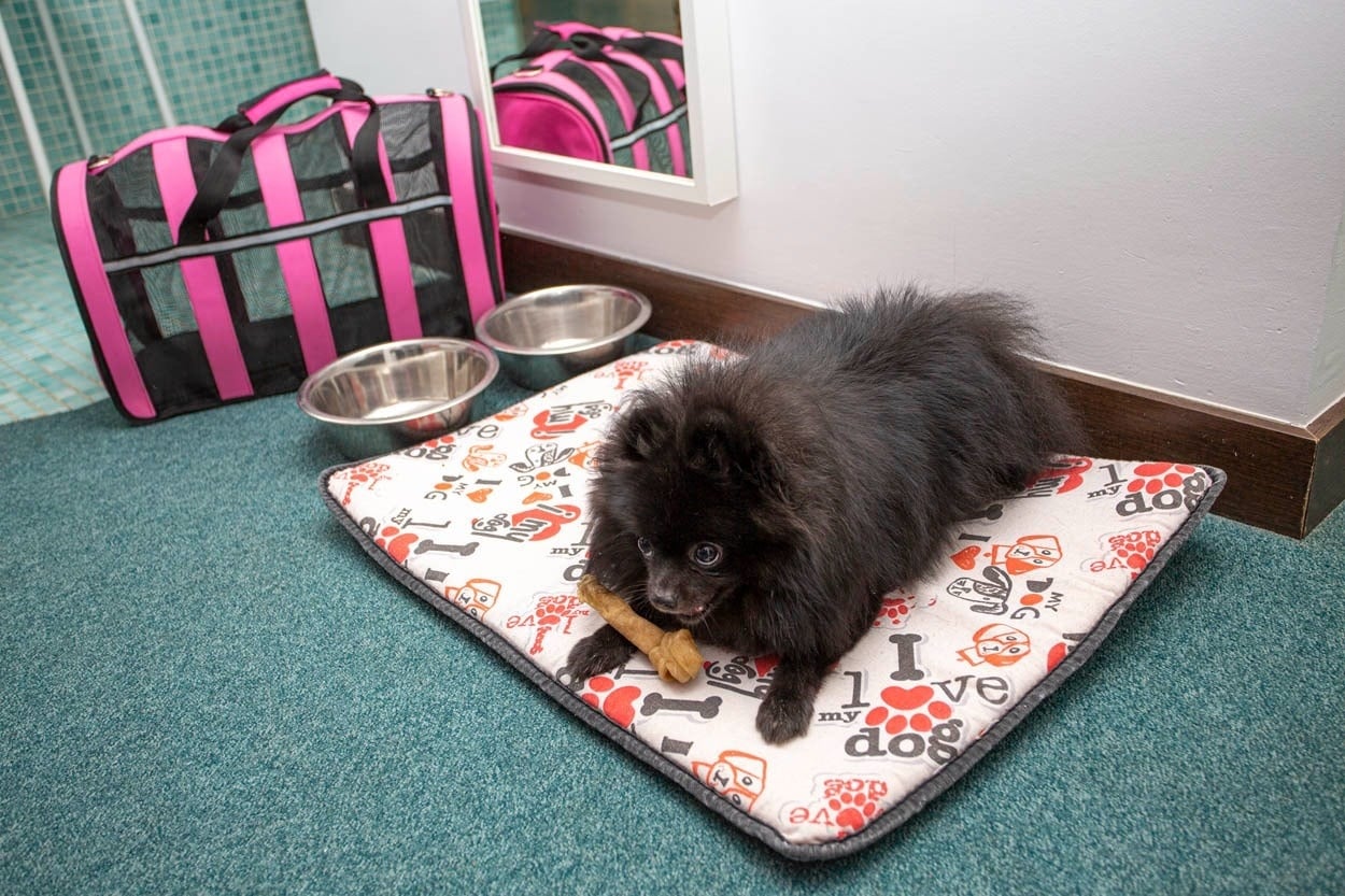 Una camita más cómoda que el sofá que tiene prohibido en casa. Su propio set de restaurante canino (comedero y bebedero incluidos). Un snack de bienvenida para que empiece con buen pie… ¡o pata!