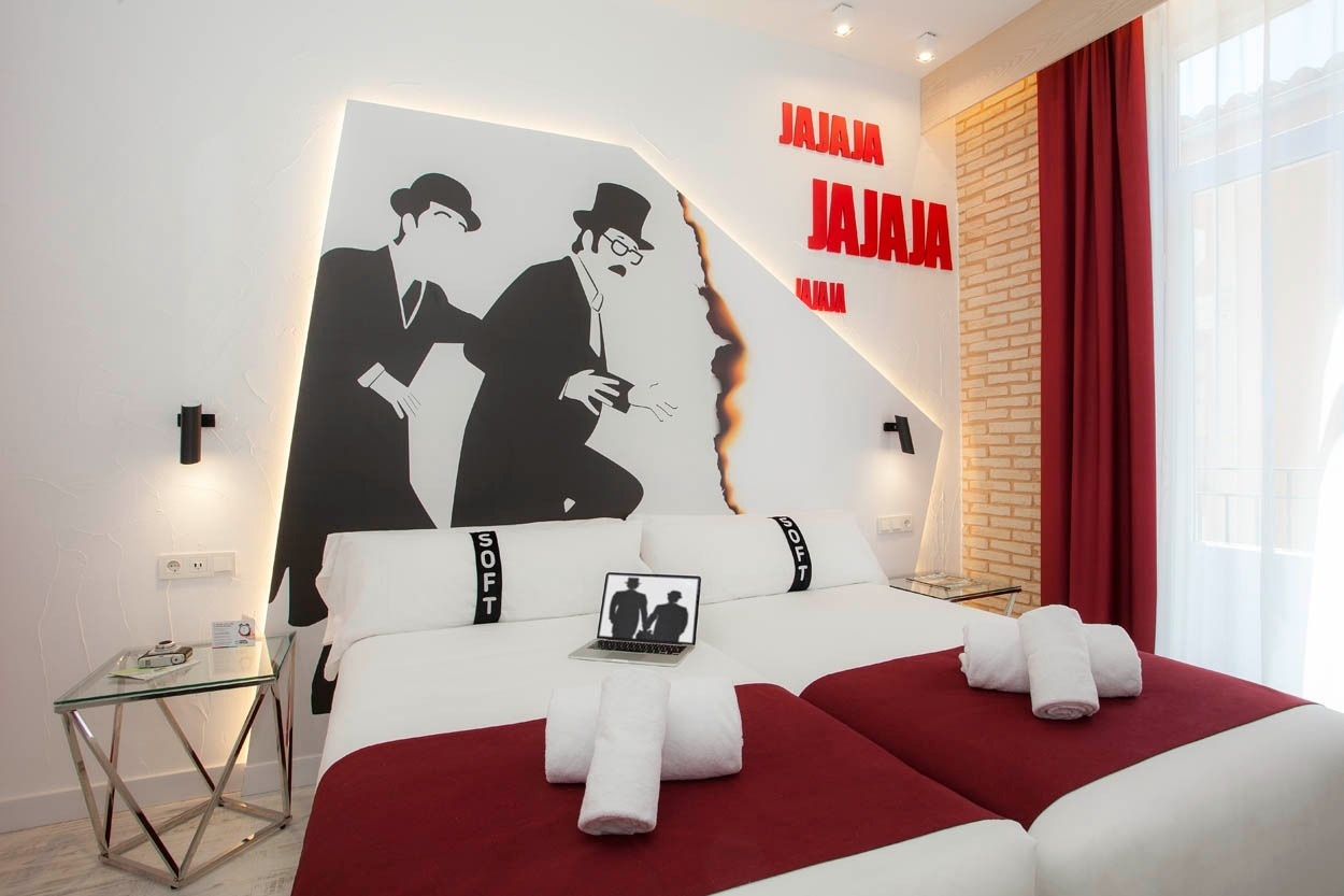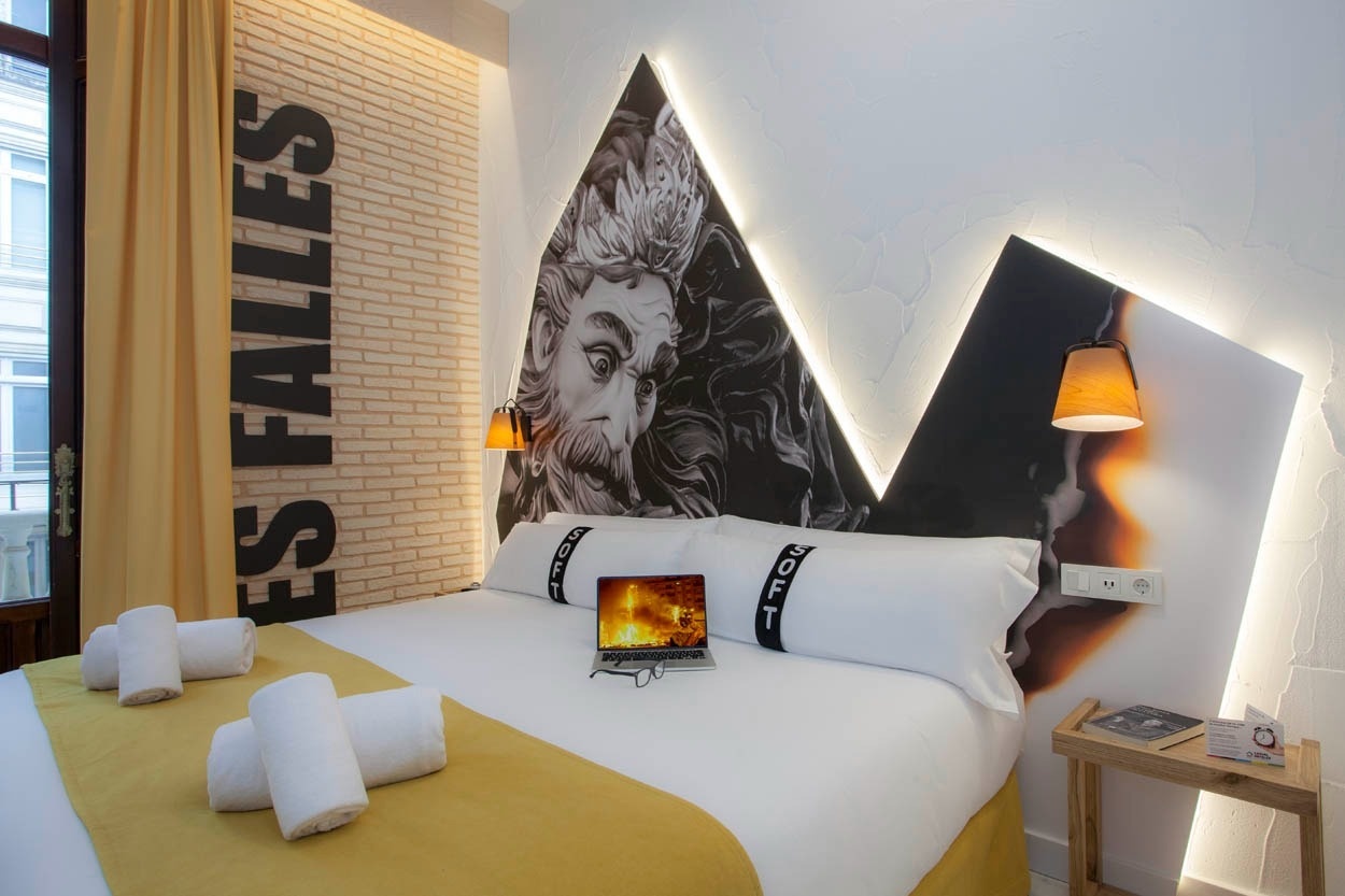 Aquí no vienes solo a dormir; vienes a vivir una experiencia. Mis 35 habitaciones están diseñadas para sumergirte en la esencia de Valencia. Cada una cuenta una historia: desde los fuegos de las Fallas hasta los sabores únicos de nuestra gastronomía y personajes que son pura esencia valenciana. Murales sorprendentes, detalles únicos y un ambiente que te hará sentir como si Valencia entera estuviera abrazándote (sin agobios, claro).