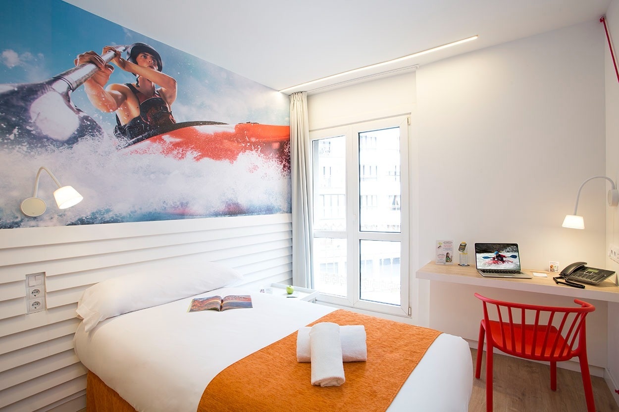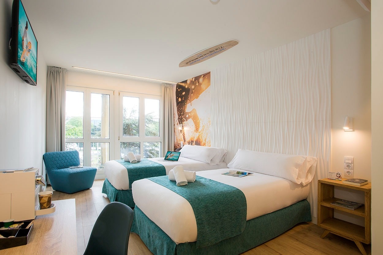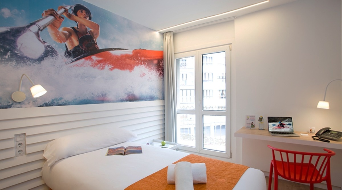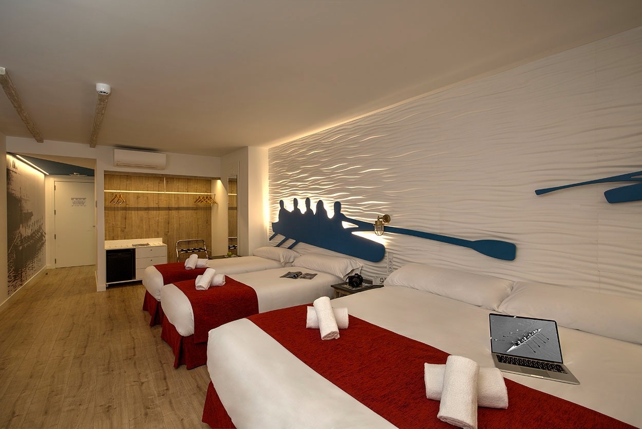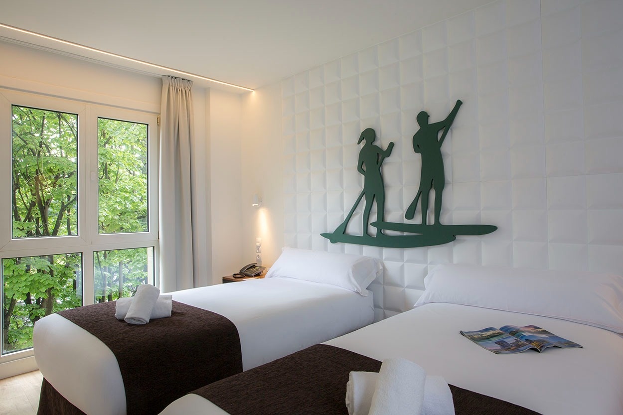 Stellen Sie sich eine Mischung aus einer baskischen Trainera (Ruderboot) und einem Surfbrett vor: Das sind wir! Jedes Zimmer ist ein Fest aus Farbe und Originalität, mit Themen, die Ihnen das Gefühl geben werden, als würden Sie über die sieben Weltmeere segeln oder eine Welle am Gros Strand surfen.