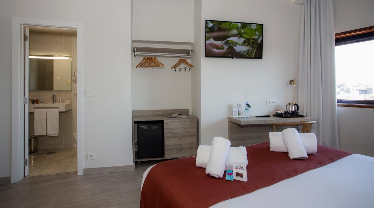 Ein Raum zum Träumen ab 20 m² in unserem Doppelzimmer mit Doppelbett. Es verfügt über einen Fernseher, kostenloses WLAN, Klimaanlage, Minibar, Safe, Schreibtisch und Haartrockner.