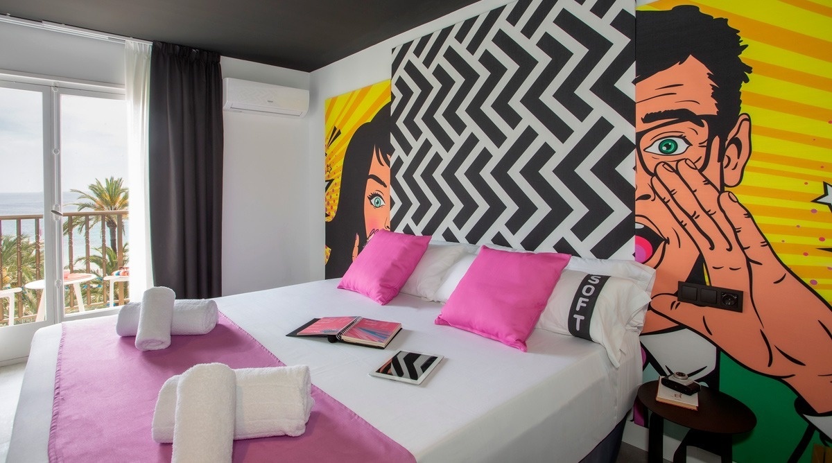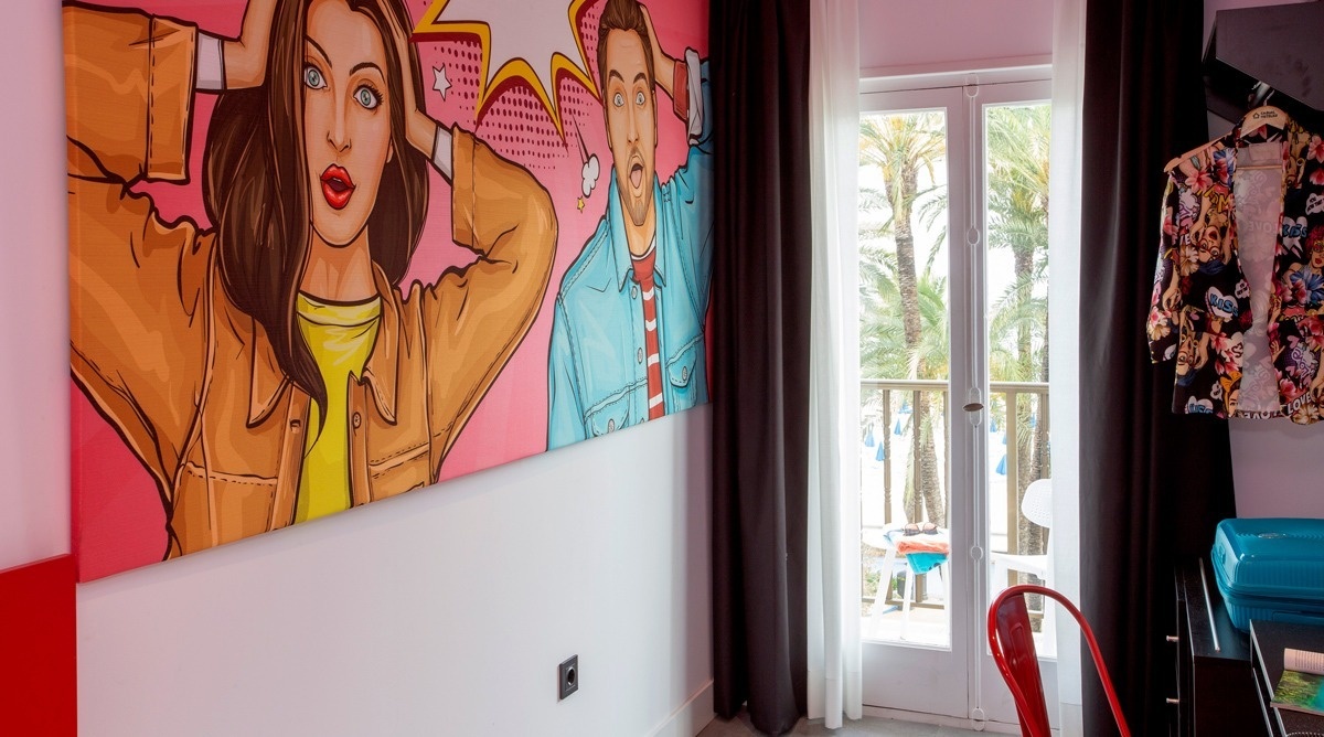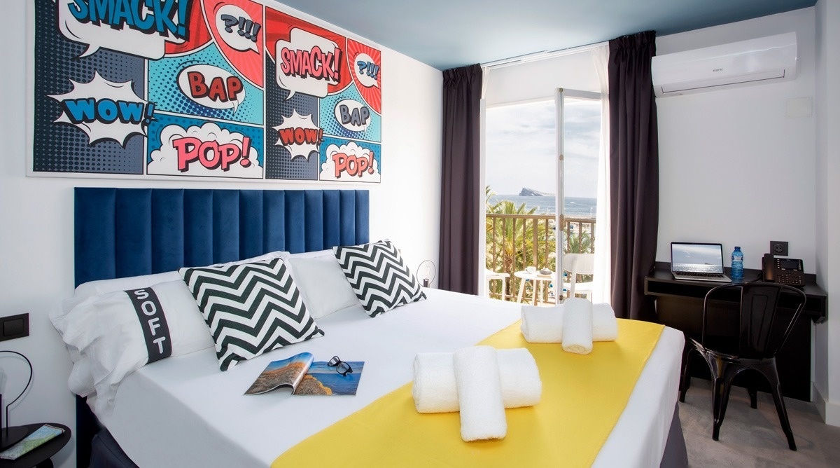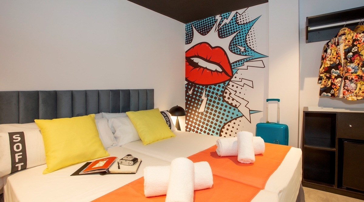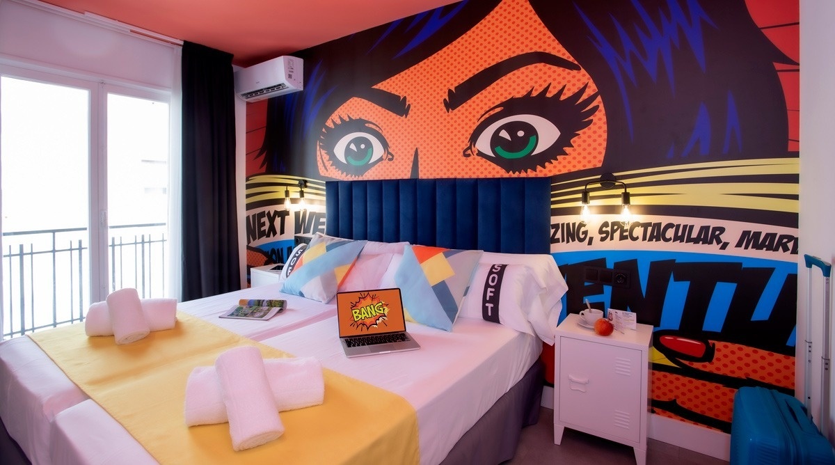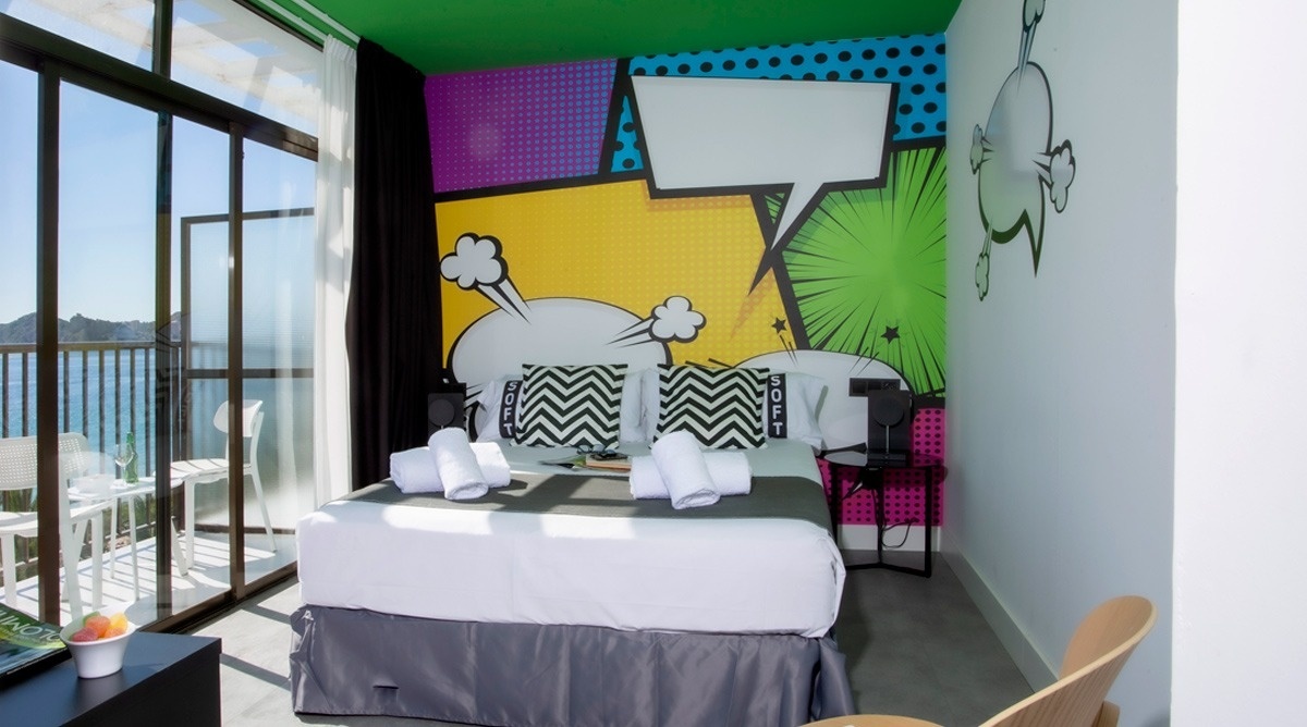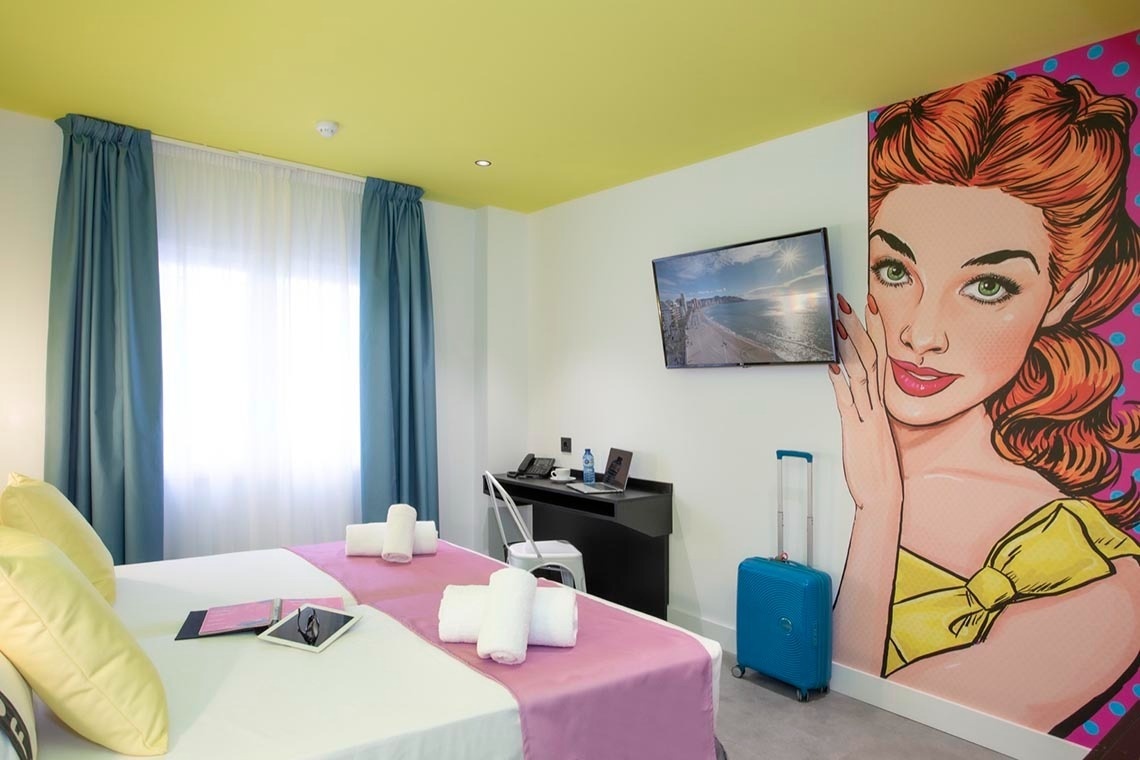 Ich bin das erste Kunsthotel in Benidorm, und meine Seele ist mit den lebendigen Farben der Pop-Art-Bewegung bemalt. Meine Wände erzählen Geschichten mit Anspielungen auf bahnbrechende Kunst, während meine Gemeinschaftsbereiche ein visuelles Spielfeld sind, wo das Mittelmeer auf die Popkultur trifft. Ich bin ein „WOW!“-Erlebnis!
