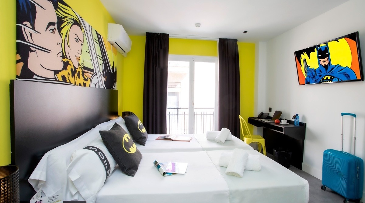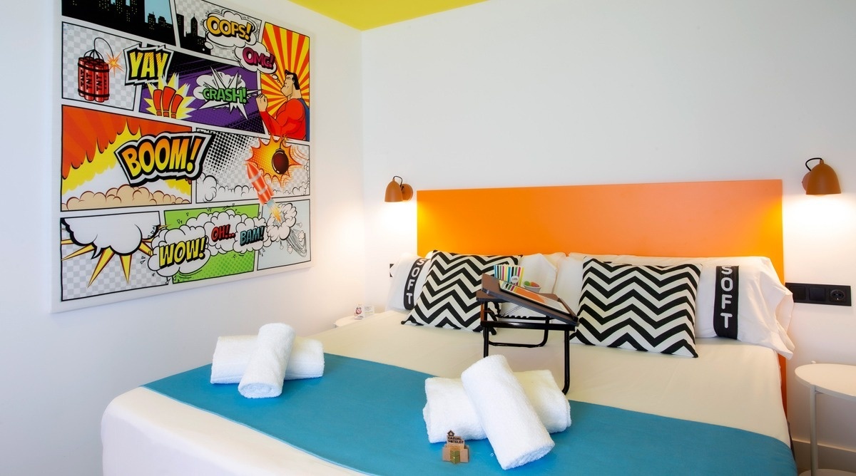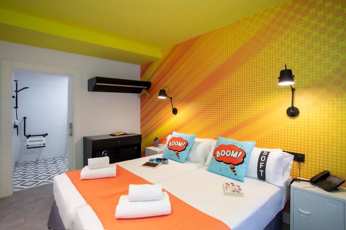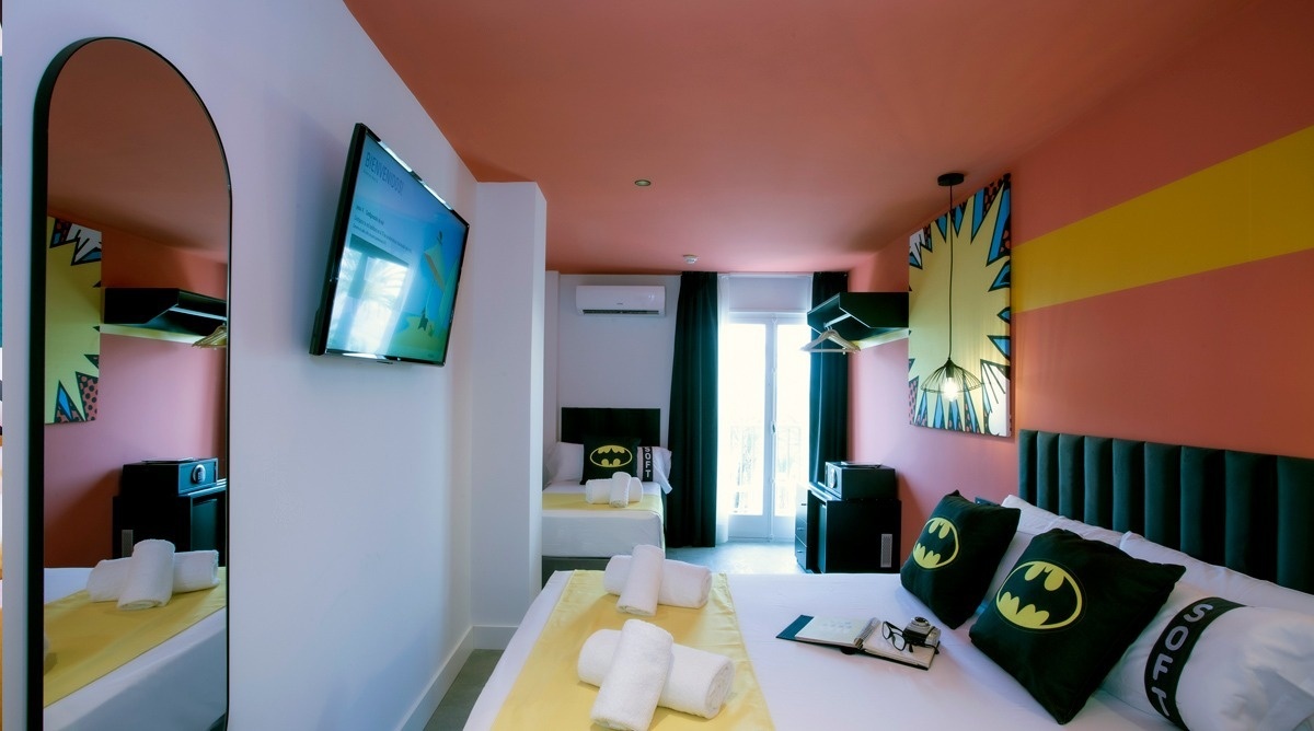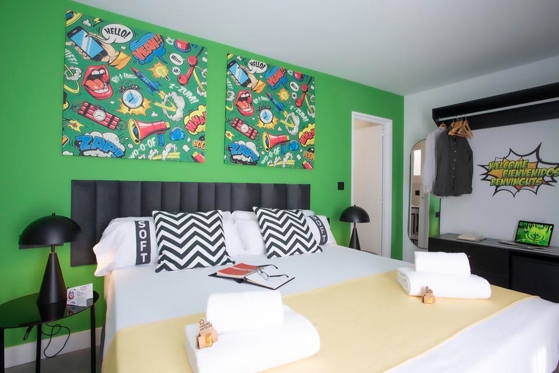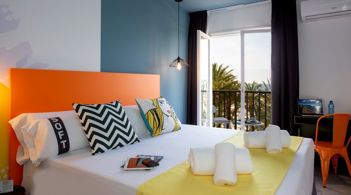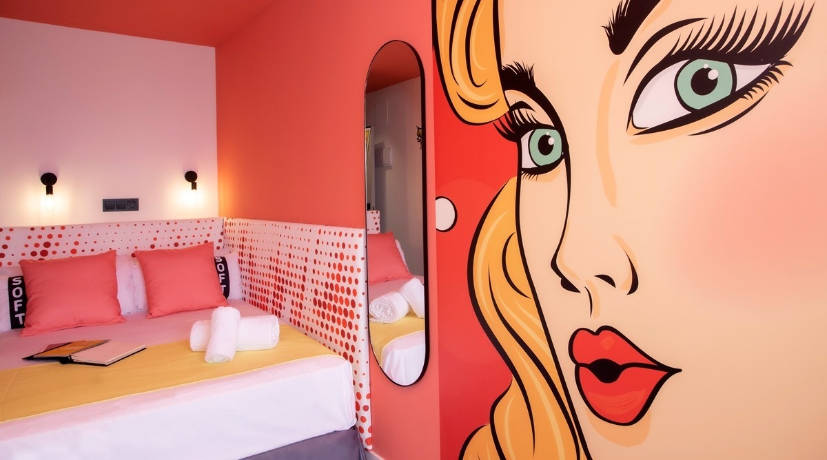 Ich bin das erste Kunsthotel in Benidorm, und meine Seele ist mit den lebendigen Farben der Pop-Art-Bewegung bemalt. Meine Wände erzählen Geschichten mit Anspielungen auf bahnbrechende Kunst, während meine Gemeinschaftsbereiche ein visuelles Spielfeld sind, wo das Mittelmeer auf die Popkultur trifft. Ich bin ein „WOW!“-Erlebnis!