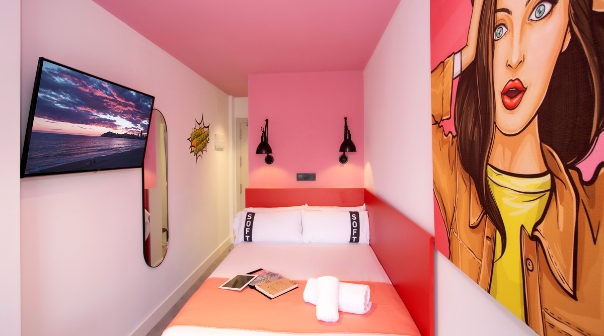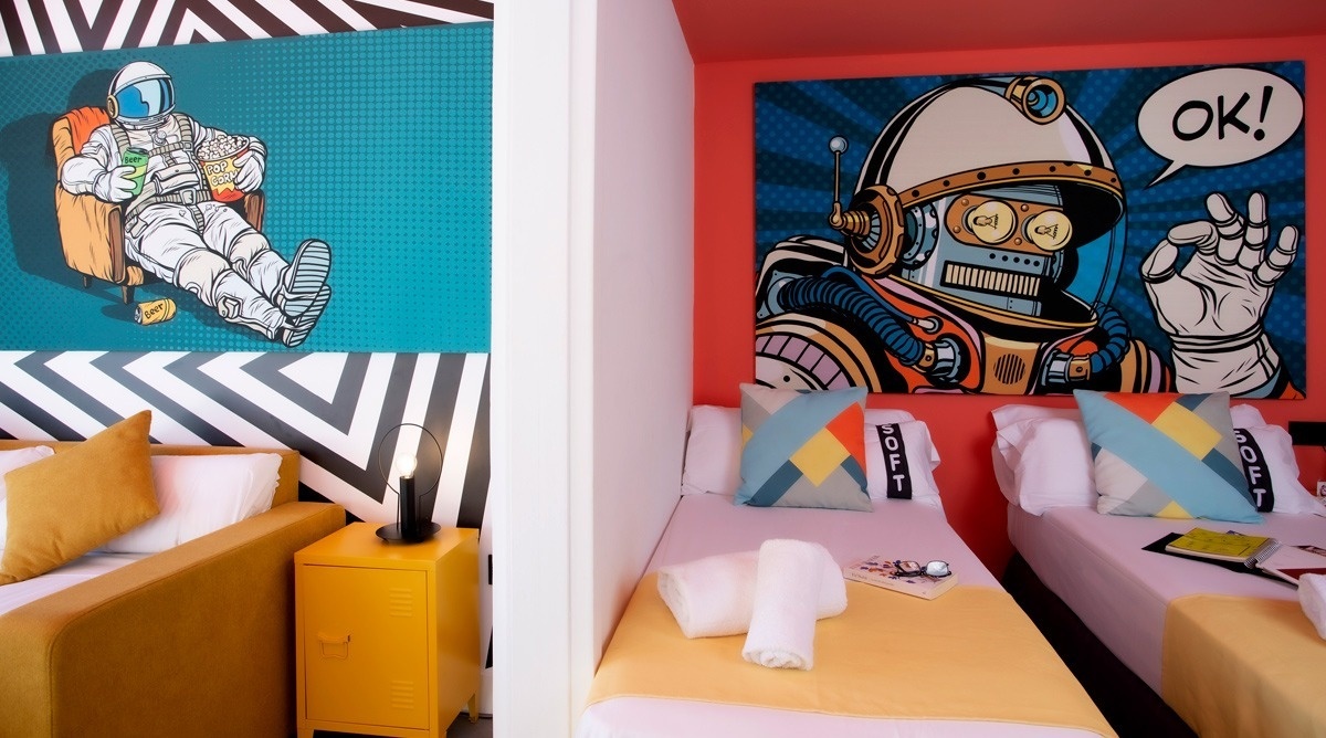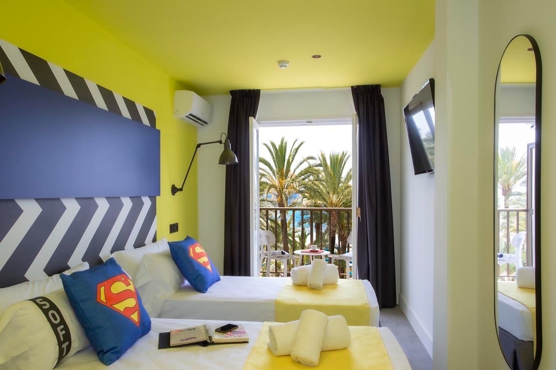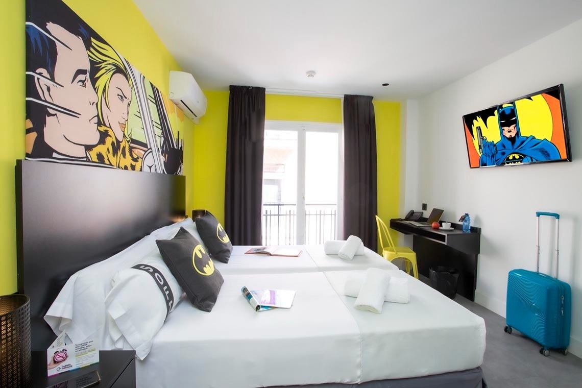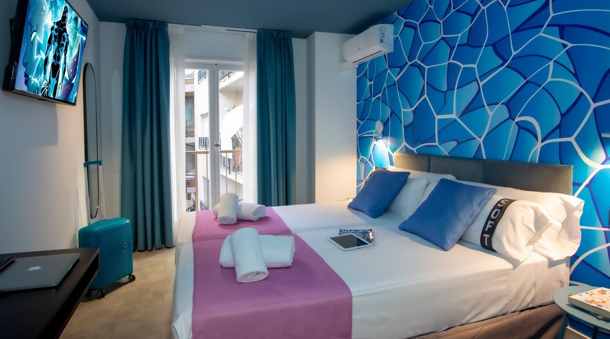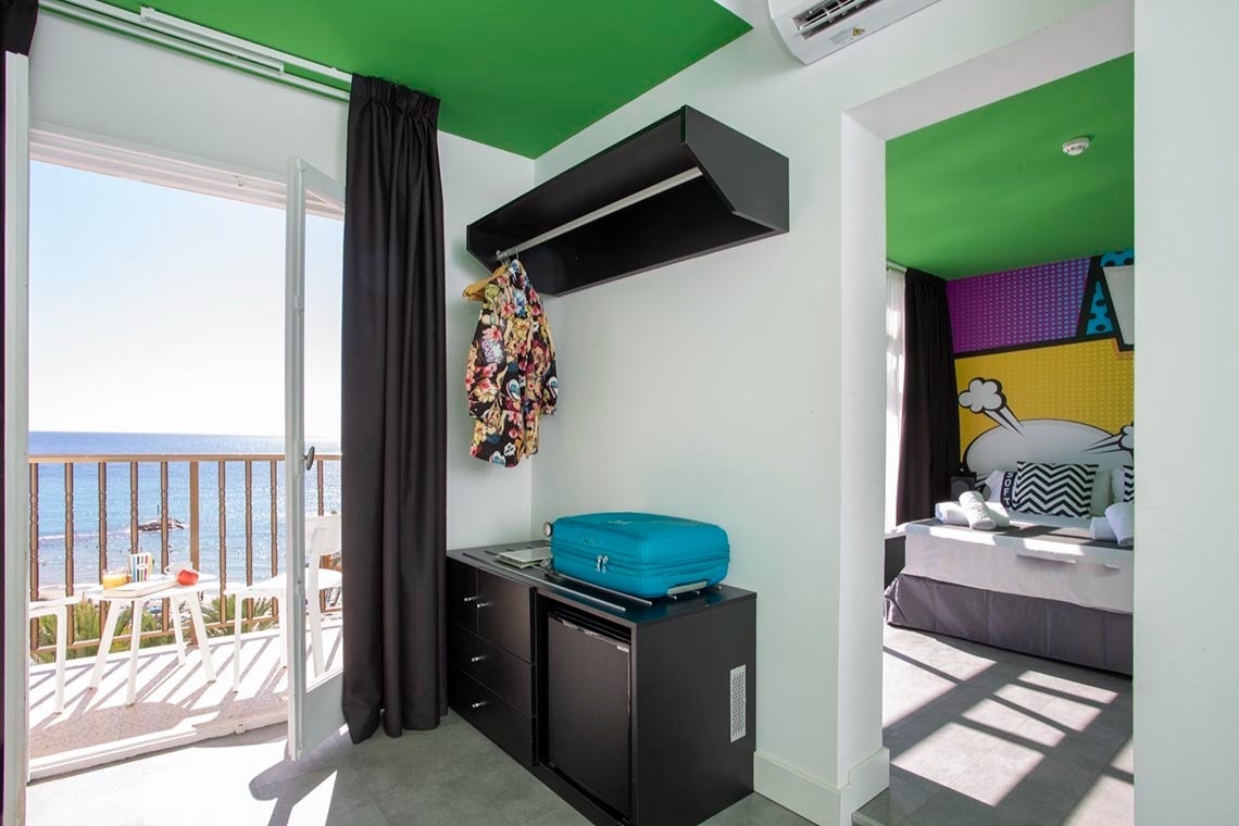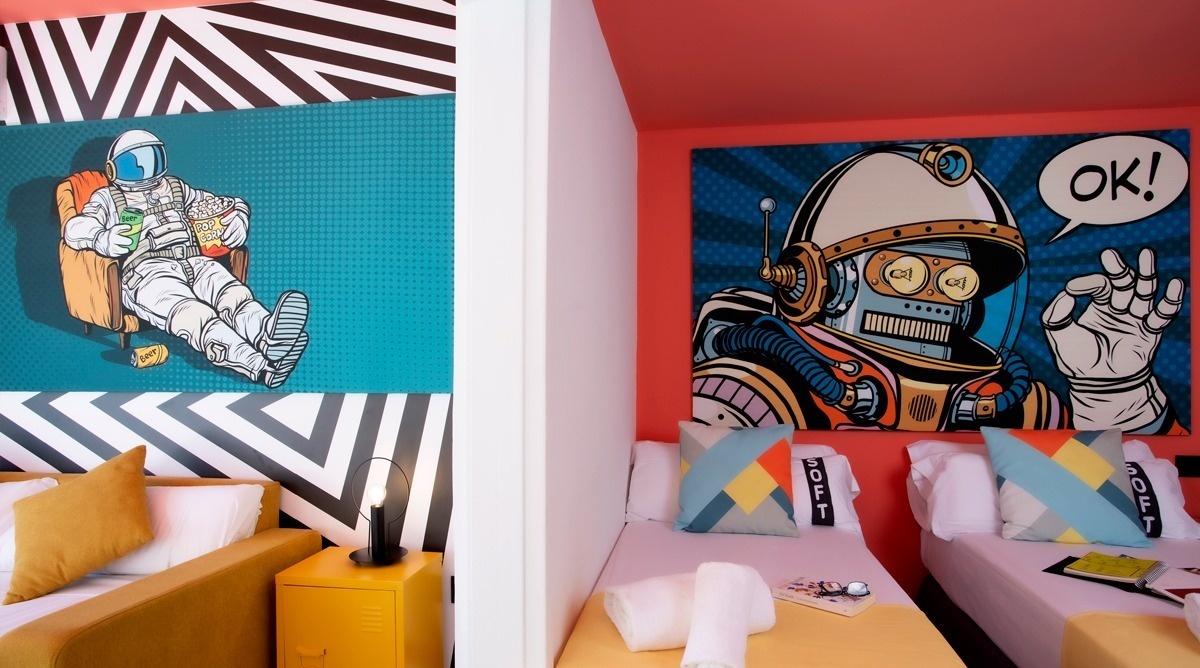 Ich bin das erste Kunsthotel in Benidorm, und meine Seele ist mit den lebendigen Farben der Pop-Art-Bewegung bemalt. Meine Wände erzählen Geschichten mit Anspielungen auf bahnbrechende Kunst, während meine Gemeinschaftsbereiche ein visuelles Spielfeld sind, wo das Mittelmeer auf die Popkultur trifft. Ich bin ein „WOW!“-Erlebnis!